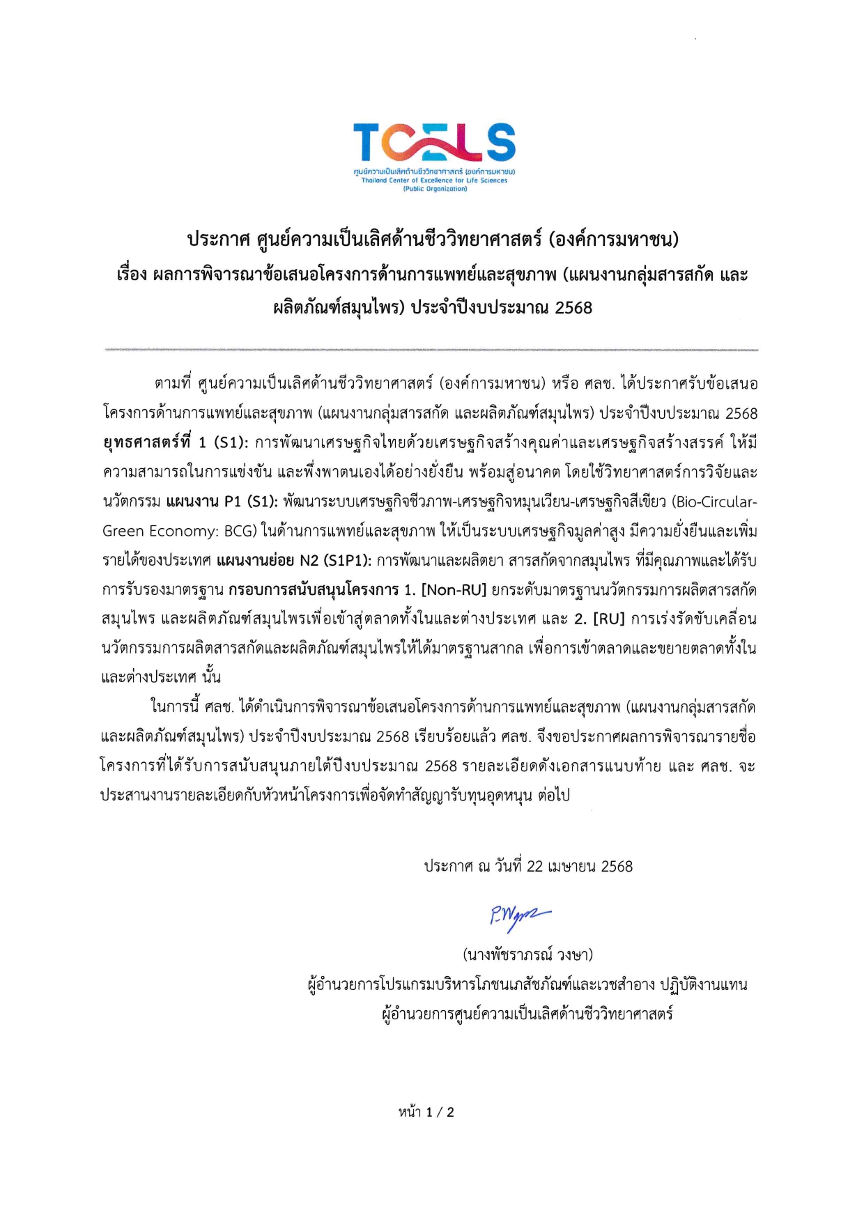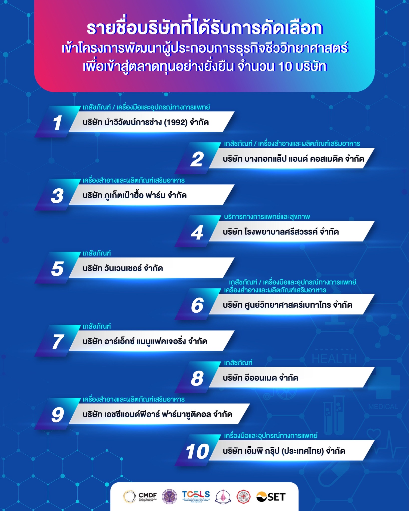 ทีเซลส์ เผยรายชื่อ 10 ผู้ประกอบผ่านการคัดเลือกสู่ “โครงการการพัฒนาธุรกิจชีววิทยาศาสตร์เพื่อเข้าสู่ตลาดทุนอย่างยั่งยืน”