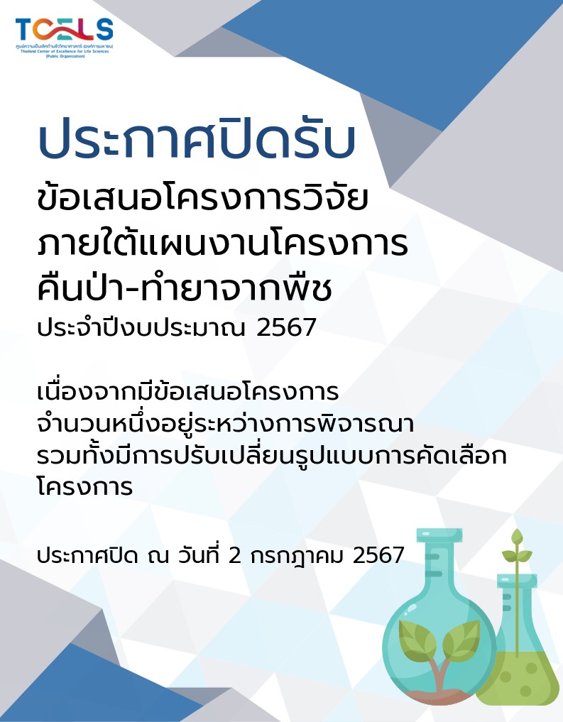 ประกาศปิดรับข้อเสนอโครงการวิจัยภายใต้แผนงานโครงการคืนป่า-ทำยาจากพืช